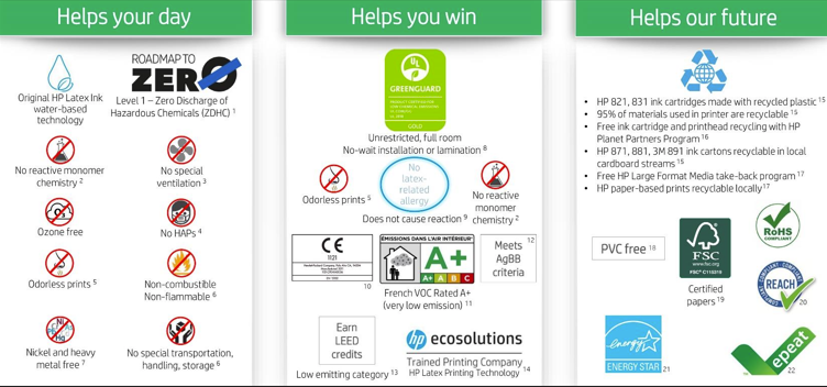 Water-based HP Latex Inks offer health and environmental advantages - compared to eco-solvent, solvent, or UV-curable inks - from the work zone to the point-of-display of finished prints and recycling of consumables.